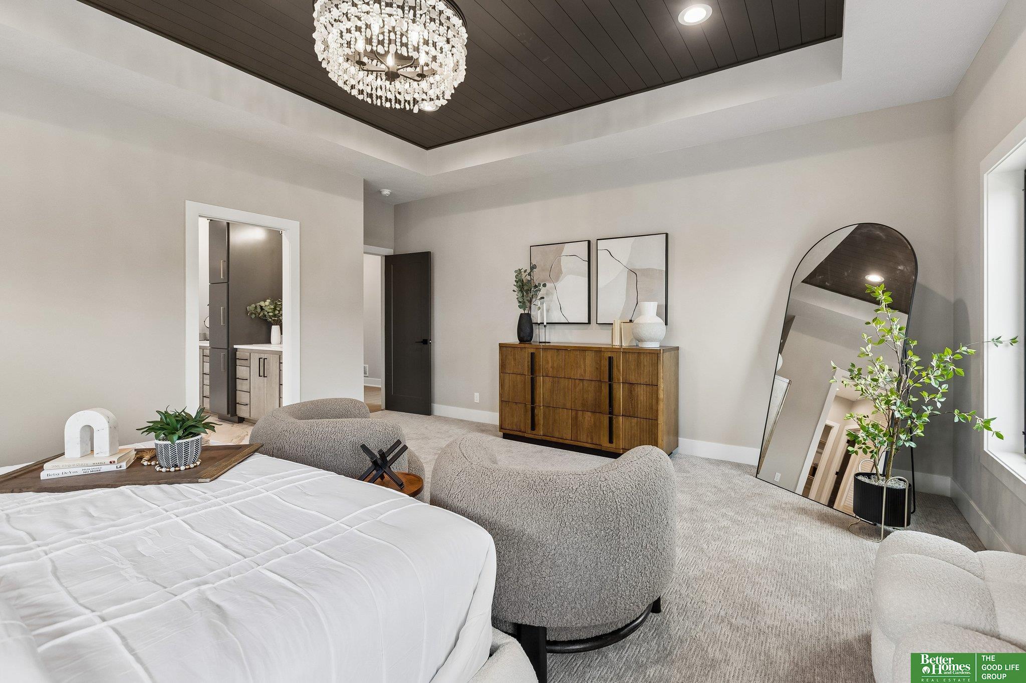 Exquisite 5 bed, 4 bath, 4-car walk-out ranch "Mahogany" plan dressed to the nines built by Kelly Construction on an oversized nearly 1/2 acre lot located in highly coveted Blue Sage Creek Estates. Feel right at home as you step into an open, sun-drenched main lvl showcasing a beautiful great rm w/soaring ceilings & gourmet kitchen offering upgraded appliances, custom soft-close cabinetry & impressive walk-in butler's pantry. Indulge in the primary suite boasting a truly luxurious full bath w/heated tile floors & gorgeous wet rm you won't want to leave. In the finished lower level fit for entertaining, a sprawling living area & custom wet bar await, as well as a spacious flex rm waiting to be transformed into a theater rm, exercise rm, or play rm. Outside, enjoy tranquil evenings in front of the cozy fire place on an expansive, covered composite deck. The oversized HEATED garage is equipped w/epoxy flooring & hot/cold spigots for your convenience. ROW OF PRIVACY TREES TO BE PLANTED!