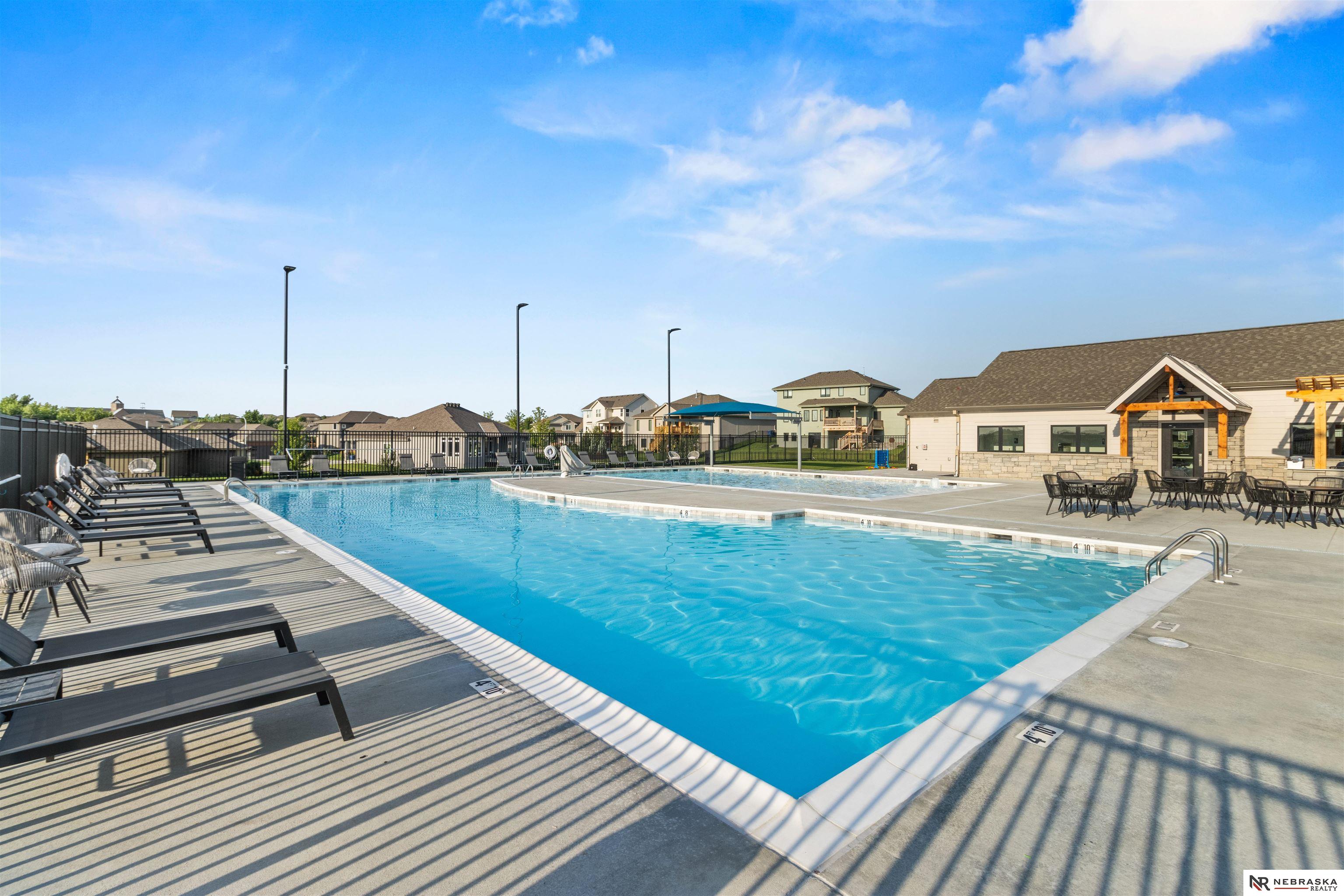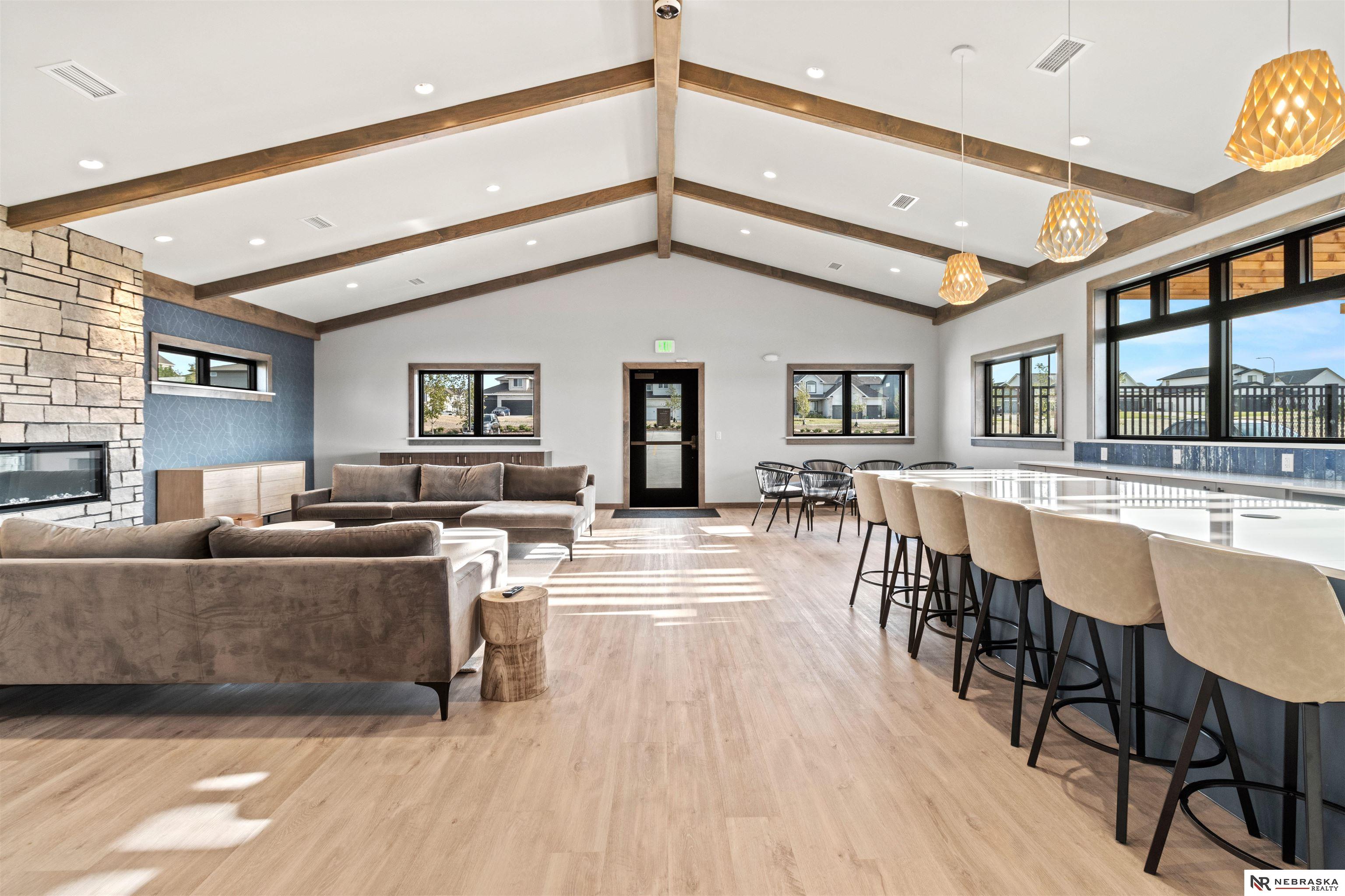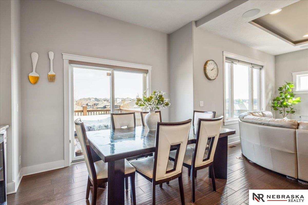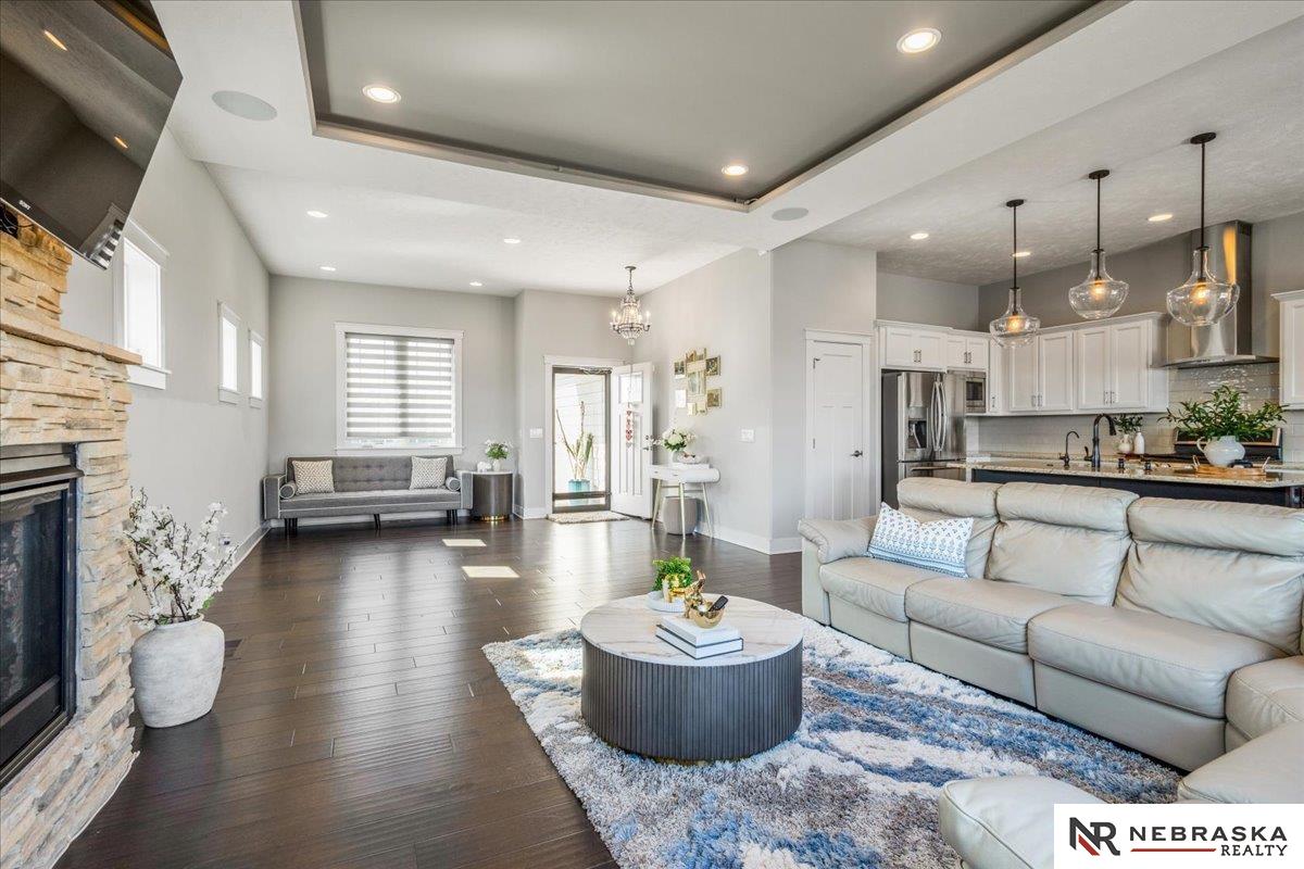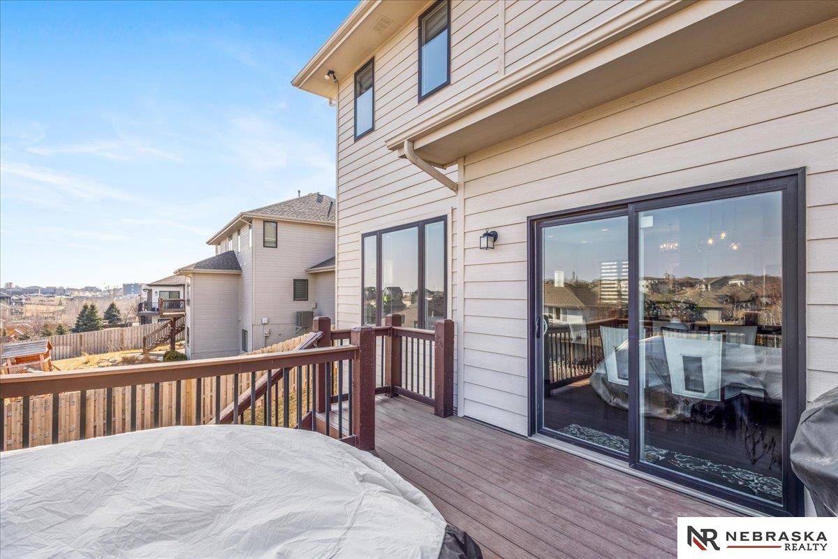 Impeccably maintained 3,058 sq ft two-story walkout in Elkhorn's sought-after Indian Pointe community, featuring 10-foot ceilings, a main-floor office, and a finished theater basement with wet bar. The open-concept main level includes quartz countertops, white cabinetry, and abundant natural light. The finished walkout basement offers a theater area, wet bar, and direct access to the backyard patio, perfect for entertaining and movie nights. Enjoy outdoor living with a low-maintenance composite deck and extended patio, both equipped with gas lines for grilling. The professionally landscaped yard includes a wood privacy fence and permanent Govee holiday lighting. Additional upgrades include a whole-home water softener and reverse osmosis system. Indian Pointe residents enjoy community amenities including a pool, clubhouse, park with green space and trails, and a basketball court. Don't miss your chance to own this beautifully kept home! AMA