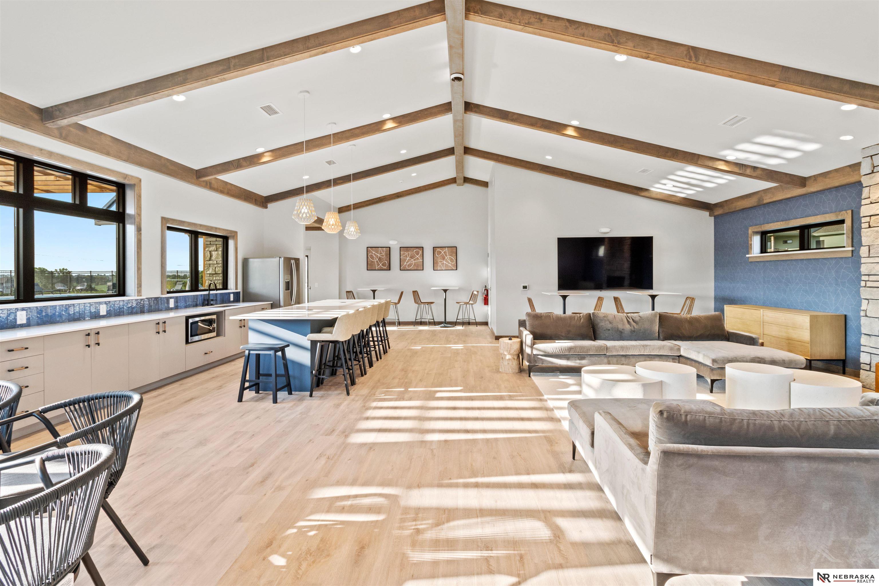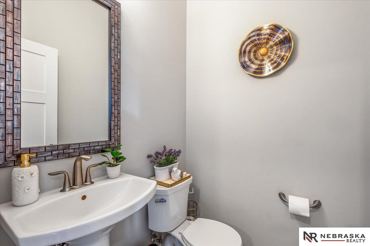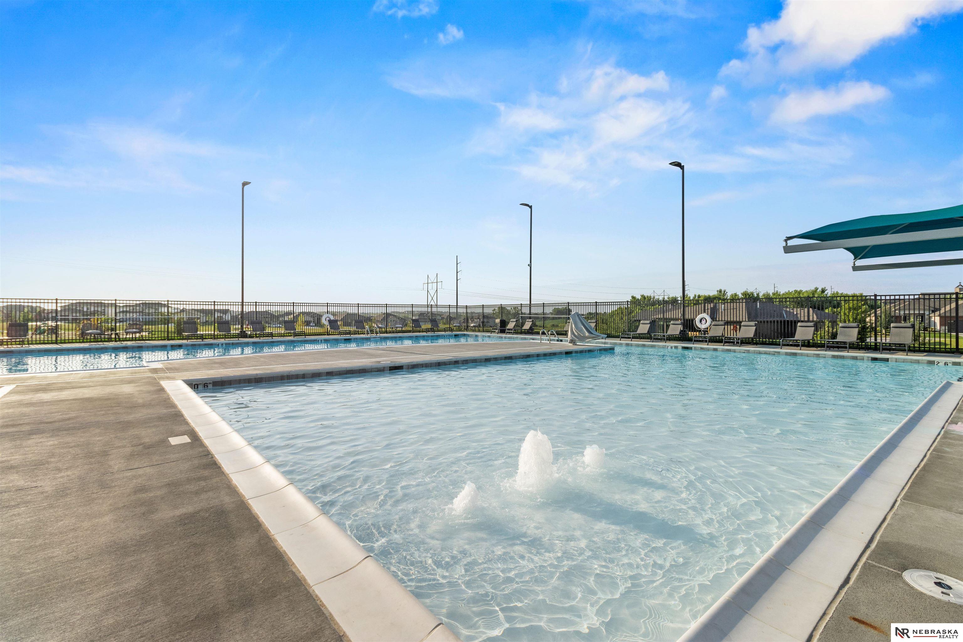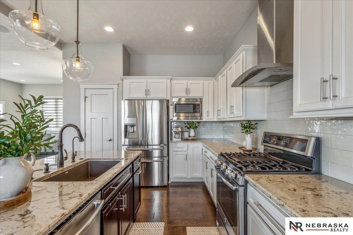 Impeccably maintained 3,058 sq ft two-story walkout in Elkhorn's sought-after Indian Pointe community, featuring 10-foot ceilings, a main-floor office, and a finished theater basement with wet bar. The open-concept main level includes quartz countertops, white cabinetry, and abundant natural light. The finished walkout basement offers a theater area, wet bar, and direct access to the backyard patio, perfect for entertaining and movie nights. Enjoy outdoor living with a low-maintenance composite deck and extended patio, both equipped with gas lines for grilling. The professionally landscaped yard includes a wood privacy fence and permanent Govee holiday lighting. Additional upgrades include a whole-home water softener and reverse osmosis system. Indian Pointe residents enjoy community amenities including a pool, clubhouse, park with green space and trails, and a basketball court. Don't miss your chance to own this beautifully kept home! AMA