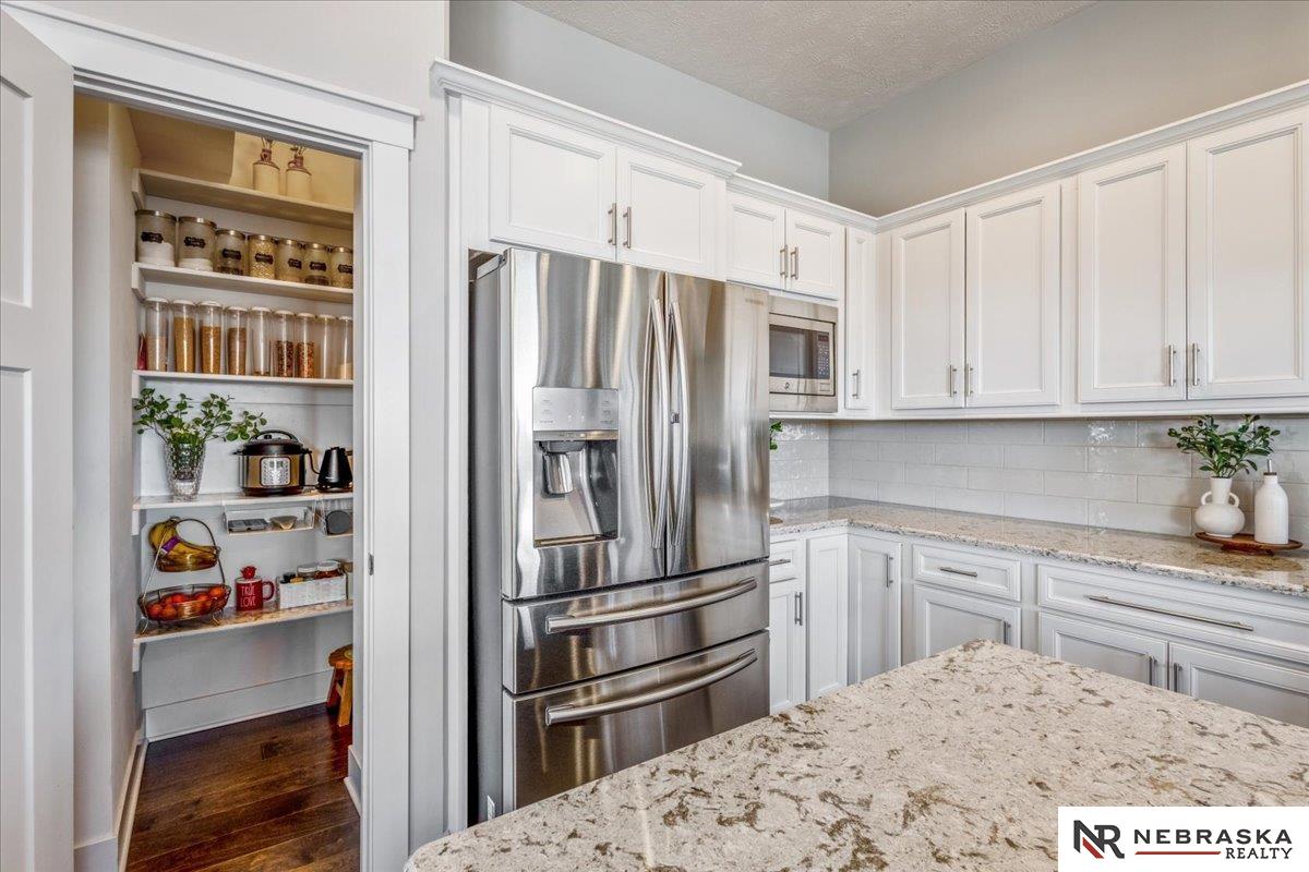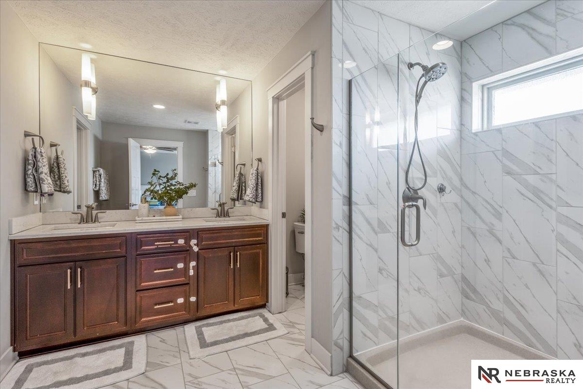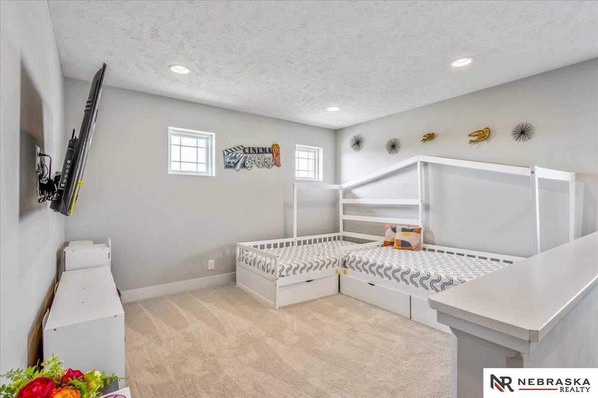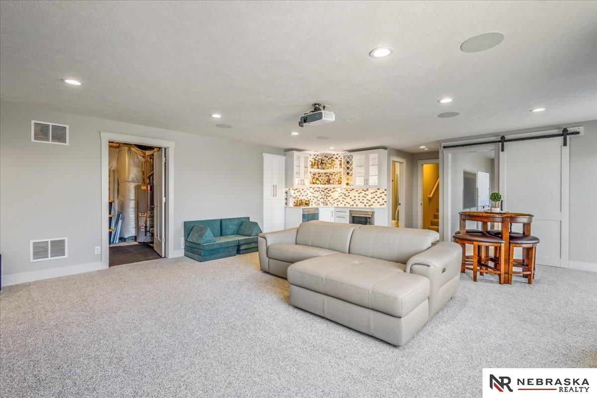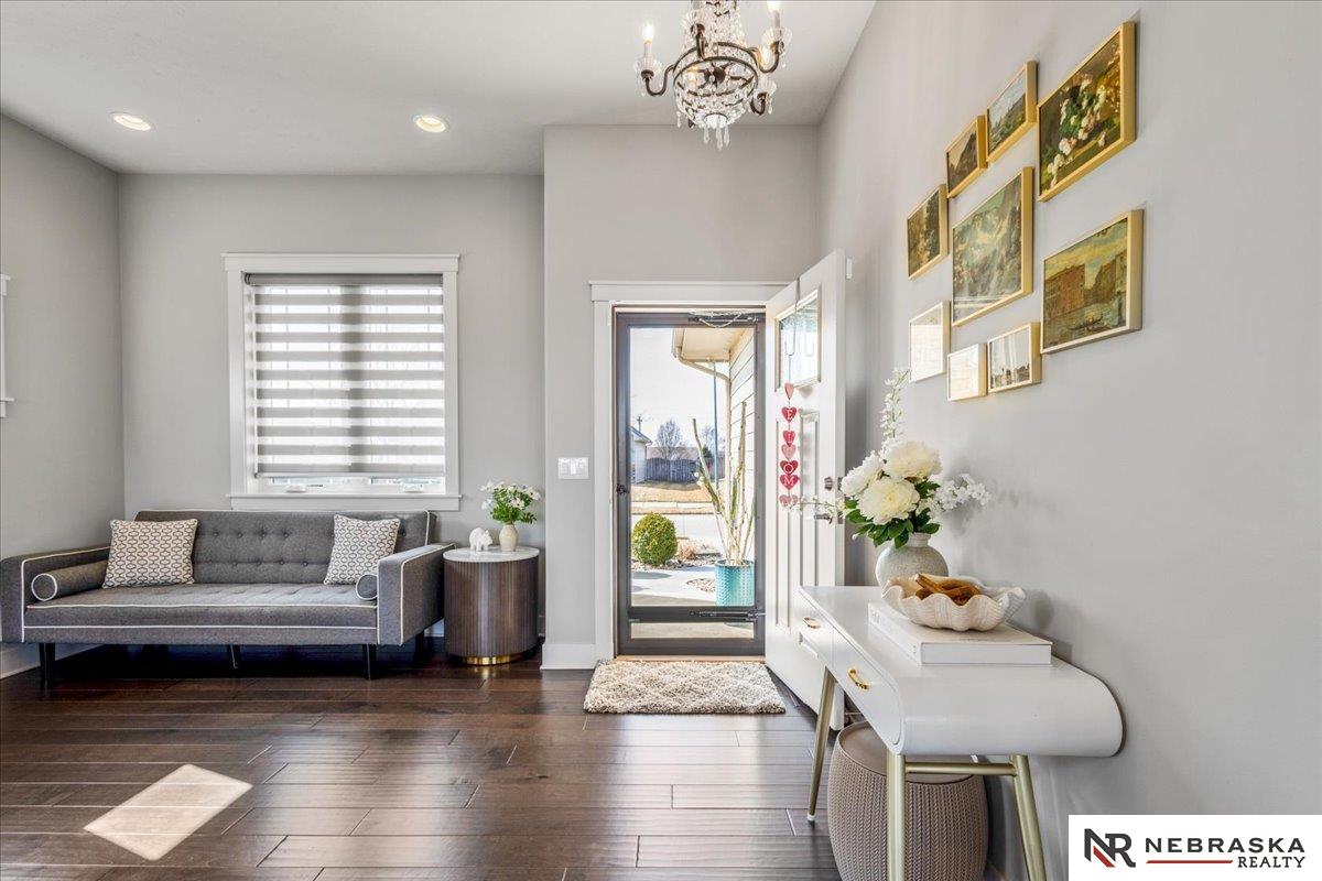 Impeccably maintained 3,058 sq ft two-story walkout in Elkhorn's sought-after Indian Pointe community, featuring 10-foot ceilings, a main-floor office, and a finished theater basement with wet bar. The open-concept main level includes quartz countertops, white cabinetry, and abundant natural light. The finished walkout basement offers a theater area, wet bar, and direct access to the backyard patio, perfect for entertaining and movie nights. Enjoy outdoor living with a low-maintenance composite deck and extended patio, both equipped with gas lines for grilling. The professionally landscaped yard includes a wood privacy fence and permanent Govee holiday lighting. Additional upgrades include a whole-home water softener and reverse osmosis system. Indian Pointe residents enjoy community amenities including a pool, clubhouse, park with green space and trails, and a basketball court. Don't miss your chance to own this beautifully kept home! AMA