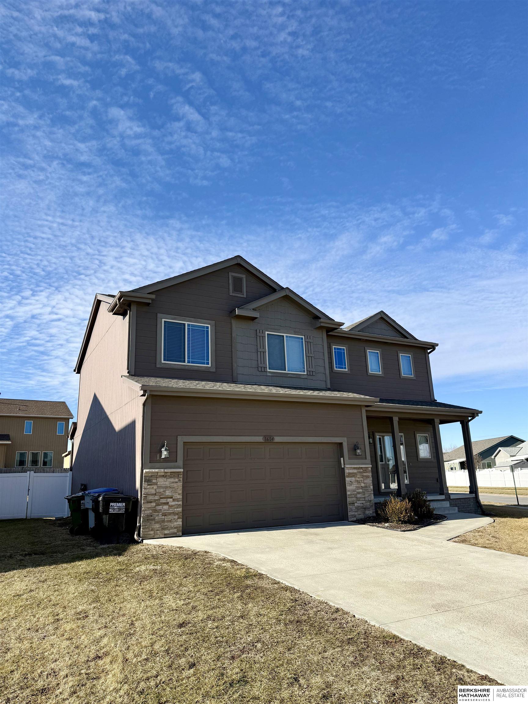 Move-In Ready Papillion Two-Story on a Corner Lot! This charming home offers instant curb appeal with a welcoming front porch and beautifully maintained interior. Inside, you'll love the open, light-filled layout with 9-foot ceilings. Ideal for everyday living and entertaining alike. The main floor features a spacious family room with large windows, stylish lighting, and a cozy fireplace, flowing seamlessly into the dining area. The impressive kitchen includes stainless steel appliances, ample counter and cabinet space, and a large walk-in pantry. Perfect for any home chef! Upstairs, the primary suite provides a walk-in closet and private ¾ bath, along with generously sized secondary bedrooms and convenient second-floor laundry. The unfinished basement is ready for your personal touch, while the oversized, fully fenced backyard offers plenty of room to relax or play. Conveniently located near schools, parks, shopping, and dining, this Papillion home checks all the boxes! Don't miss it!